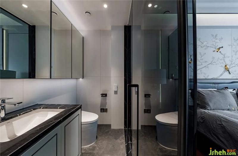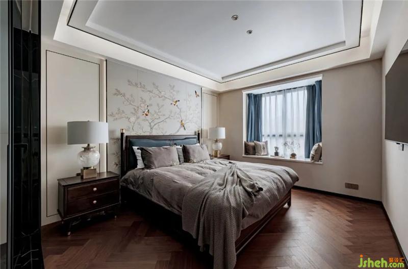 龍巖私宅設計主臥延續(xù)客廳的素雅靜謐,卻一改水墨意境,樹枝上的嬉鬧的燕雀,帶回春天的洋洋暖意與靈動的氛圍,也寓意著“比翼雙飛”的美好祝愿。