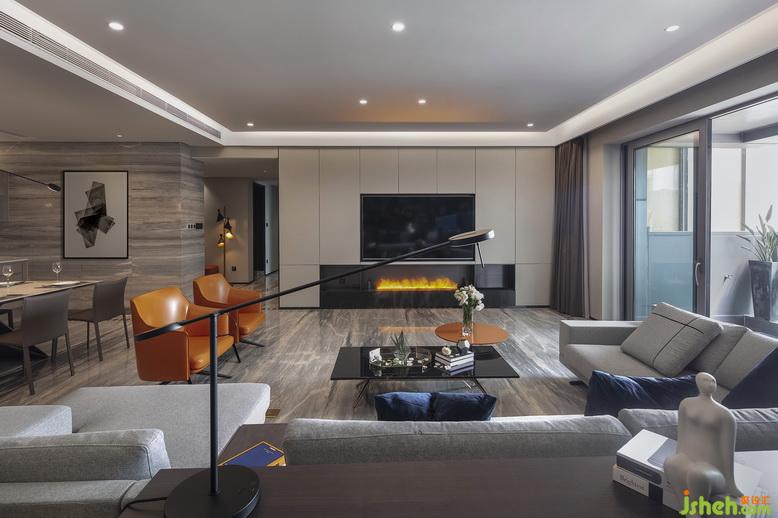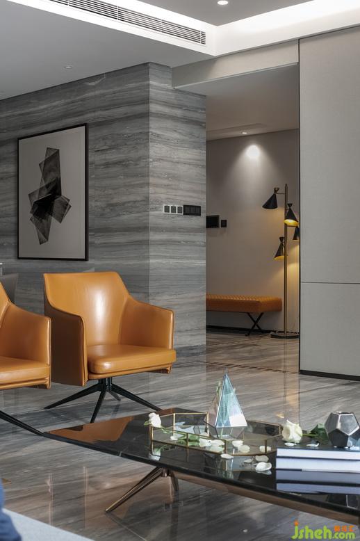 從玄關(guān)入,落座客廳,里外呼應(yīng)的一抹橙色,成為空間亮眼的存在,在上承下接的灰色墻面和地板設(shè)計(jì)中,顯得生動(dòng)活潑