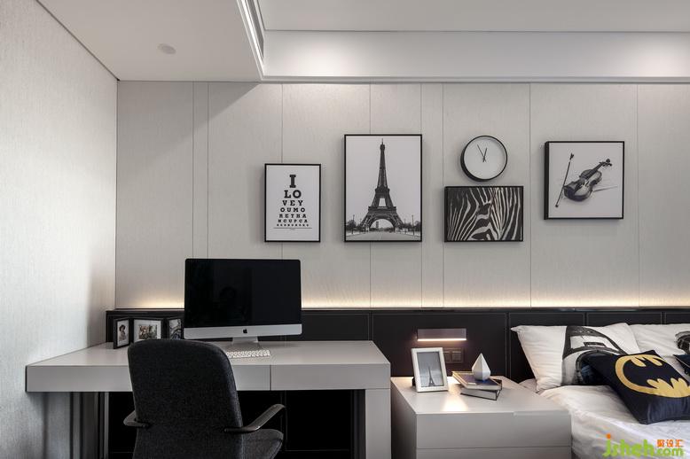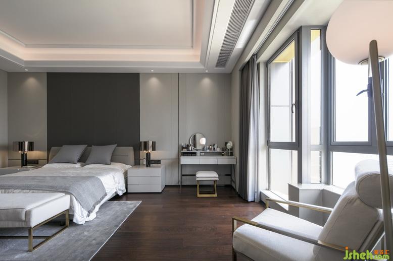 主臥依然以灰色為基調,搭配木質地板和白色墻面、家具、暖色燈系,渲染出溫和雅致的空間氛圍。日出而起,星月升而眠,一切如同房間的擺置、設計,都恰到好處。