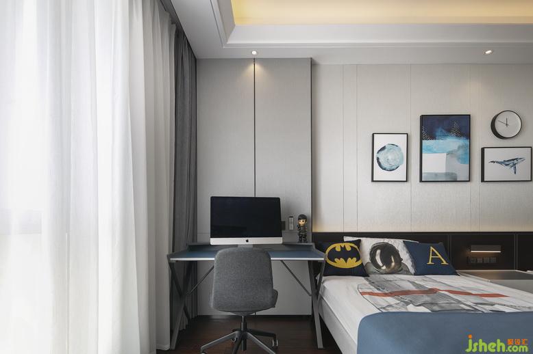 趣味性是小孩房必不可少的元素,同時對于世界的探索,也必定不能止于一面,因此,在有效利用空間的基礎上,將墻面直接設計成書柜形式,隱喻著內斂中蓄勢待發(fā)的可能性。