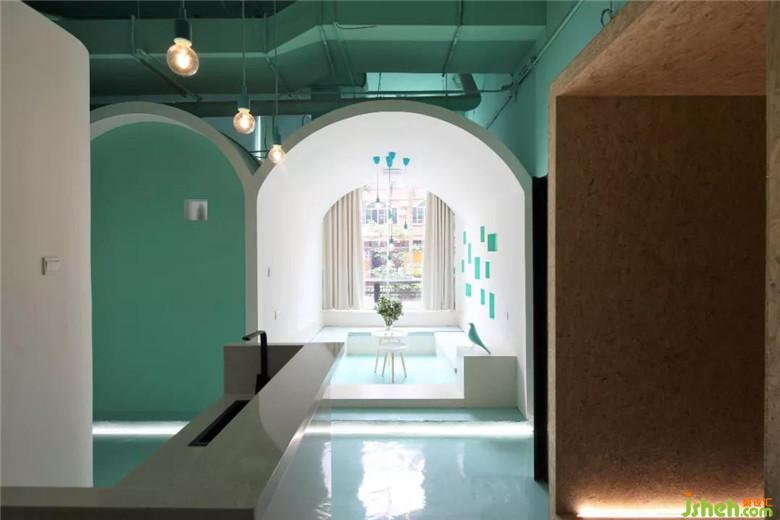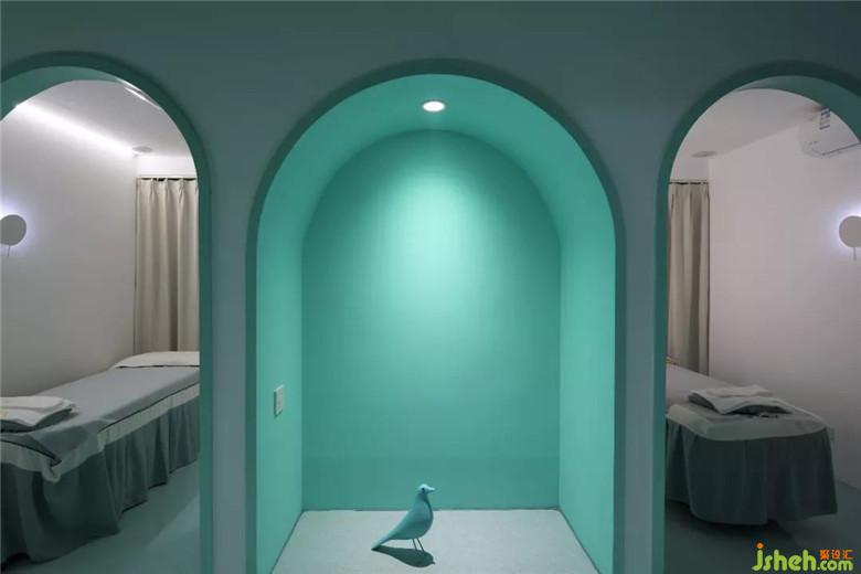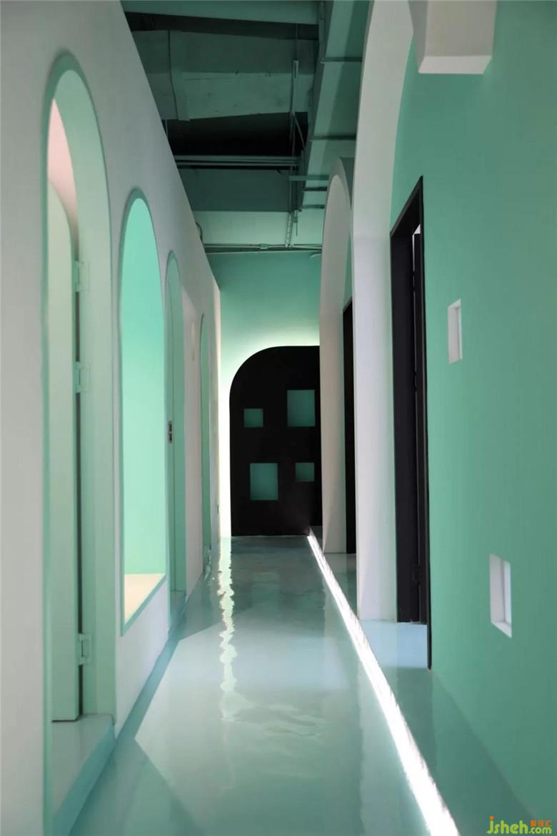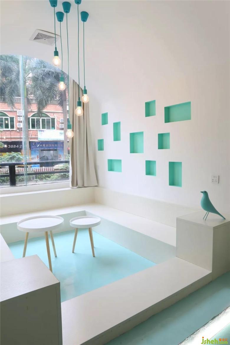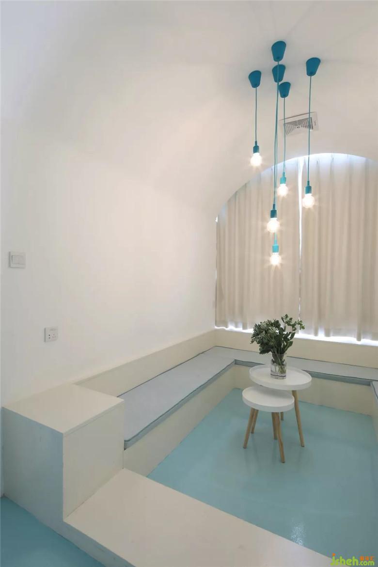 在這一片海洋或者天空的藍(lán)色長方形盒子,放進(jìn)兩個白色建筑。