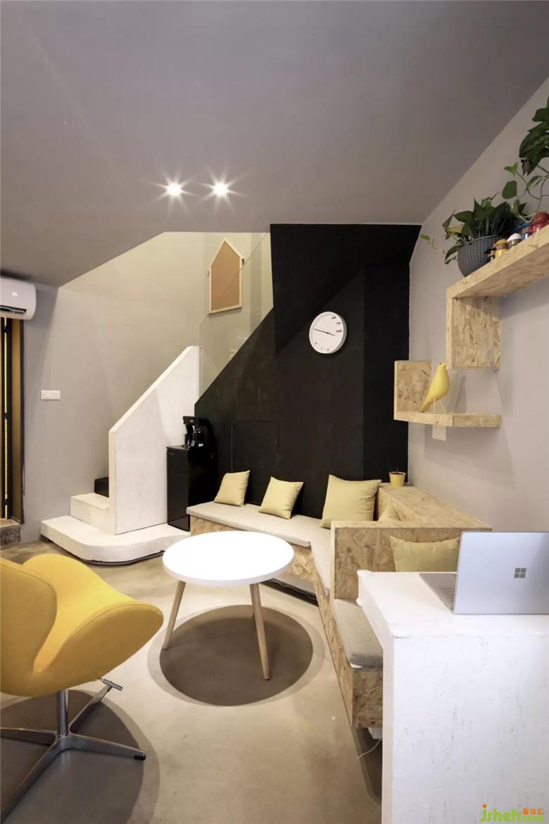 除此之外,設(shè)計(jì)師模糊了各種空間之間的界線,將前臺(tái)、接待區(qū)、樓梯間三者融合為一體,做成相互照應(yīng)與銜接的多功能區(qū)域,同時(shí)也成為了垂直交通的風(fēng)景線。