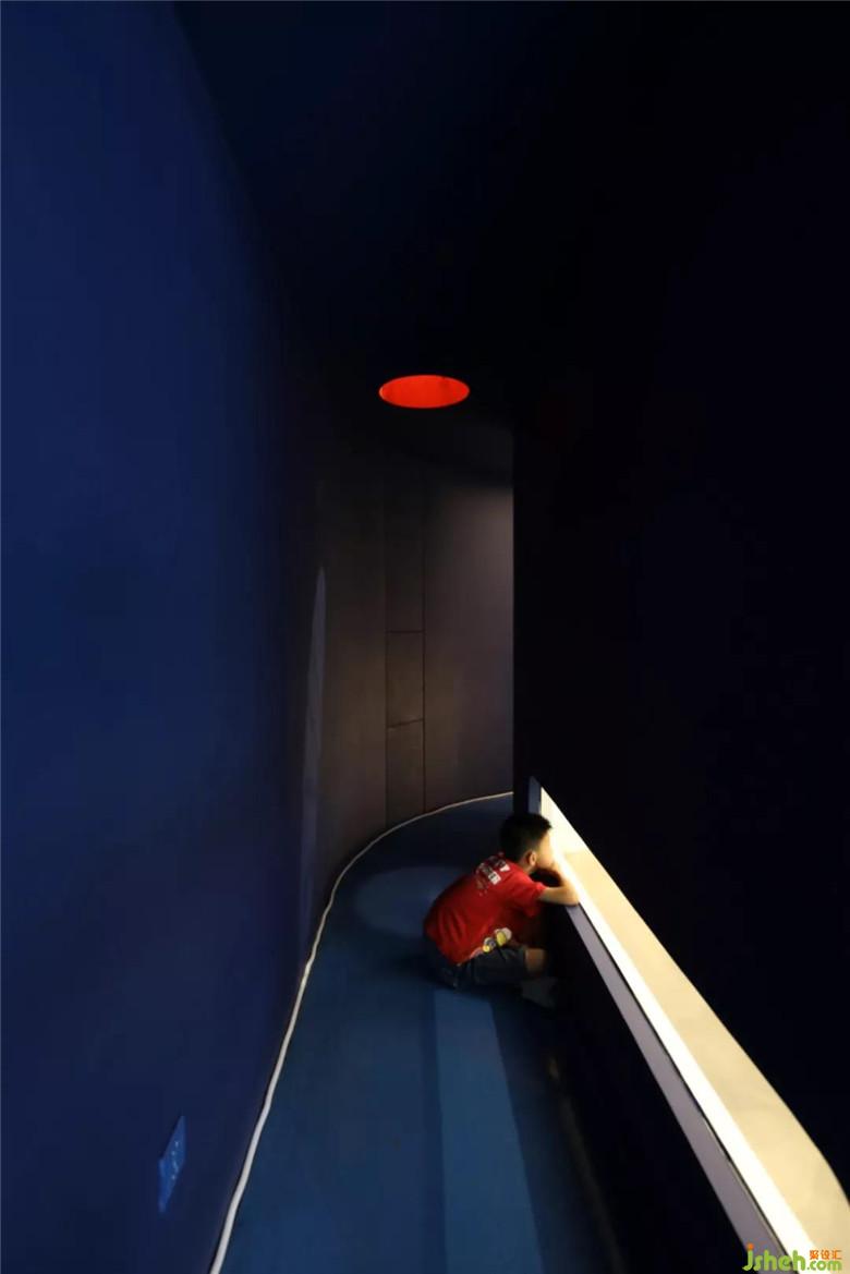 于是設(shè)計(jì)師為空間設(shè)計(jì)了兩條交通動(dòng)線,一條是公司LOGO、文化展示的平凡之路,一條是擁有神秘氣質(zhì)的深空隧道。在深藍(lán)色隧道深處,有一個(gè)類似黑洞的紅色天窗直通二樓,為上下兩個(gè)空間的互動(dòng)增添了些許趣味。不同的人們,進(jìn)入空間的感受是不一樣的。深諳世事的大人們喜歡走平凡之路,充滿童真的孩子們喜歡走深空隧道,去探索未知的世界。