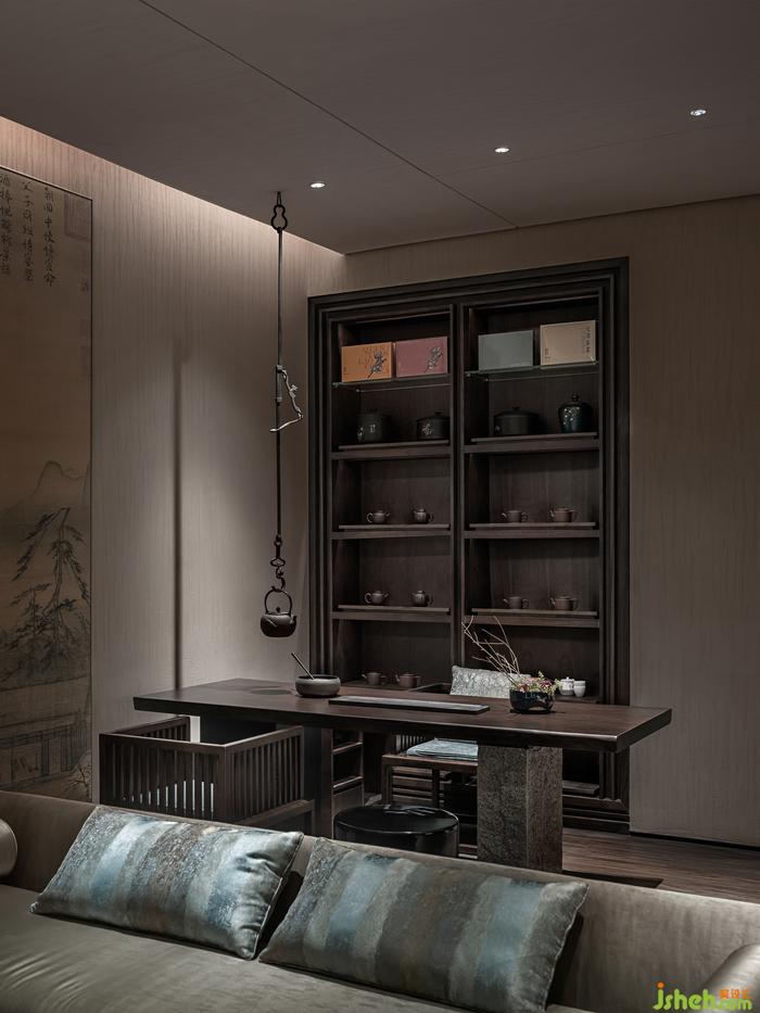 回到《思源書館》空間,“移竹當(dāng)窗,分梨為院”園林手法與《雅談閣》來隔斷。溶溶月色,瑟瑟風(fēng)聲,格柵式的窗簾透過光,疏影橫斜 而入,會(huì)所裝修設(shè)計(jì)映照在書桌上, “光”的生機(jī)主義娓娓道來。拿起書本閱讀,彷佛處于山居般讀書生活場景。