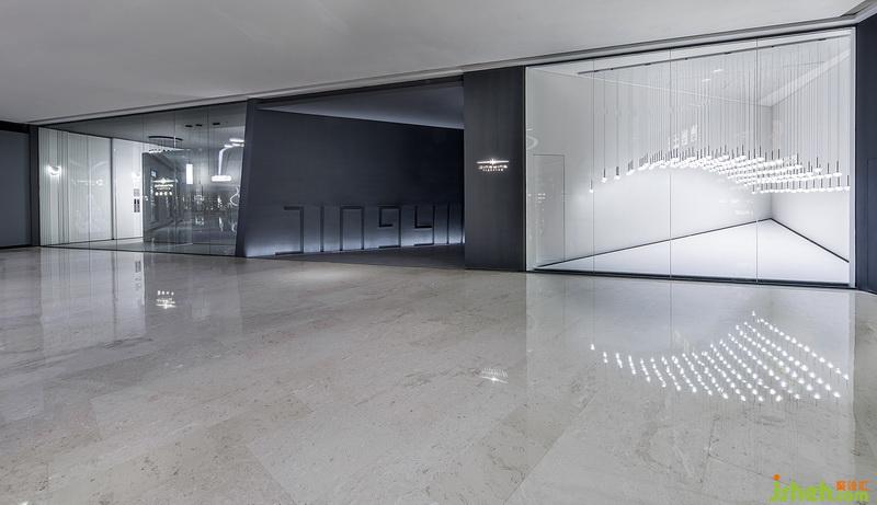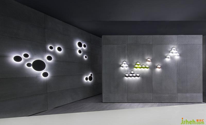 本案在材料方面室內設計師多使用純色建材,內部色彩以白色與灰色為主,使得展廳看起來現代摩登,卻又不喧賓奪主,突出燈飾的主角地位。