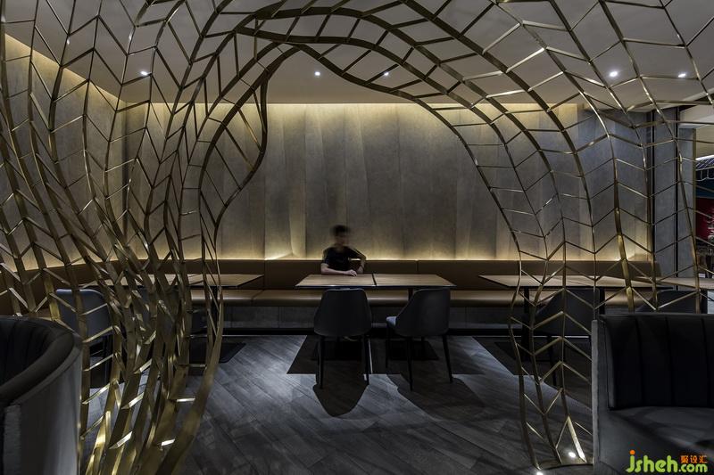 該設(shè)計(jì)符號(hào)經(jīng)過(guò)設(shè)計(jì)師的應(yīng)用,在空間里充分體現(xiàn)自然之美。從餐廳的主入口進(jìn)來(lái),首先經(jīng)過(guò)開(kāi)放式就餐區(qū),座位配置以木制的餐桌為主,入口水吧區(qū)的飄帶線條裝置則帶動(dòng)視線移動(dòng)、穿透,該裝置使用不銹鋼的硬朗材質(zhì)糅合舒展的線條,隱約描繪出一幅云動(dòng)水卷的自然景象。隨著這優(yōu)美的線條移動(dòng),則進(jìn)入到網(wǎng)狀不銹鋼獨(dú)立就餐區(qū)。