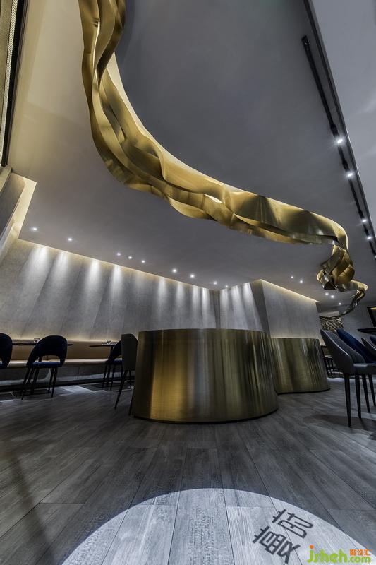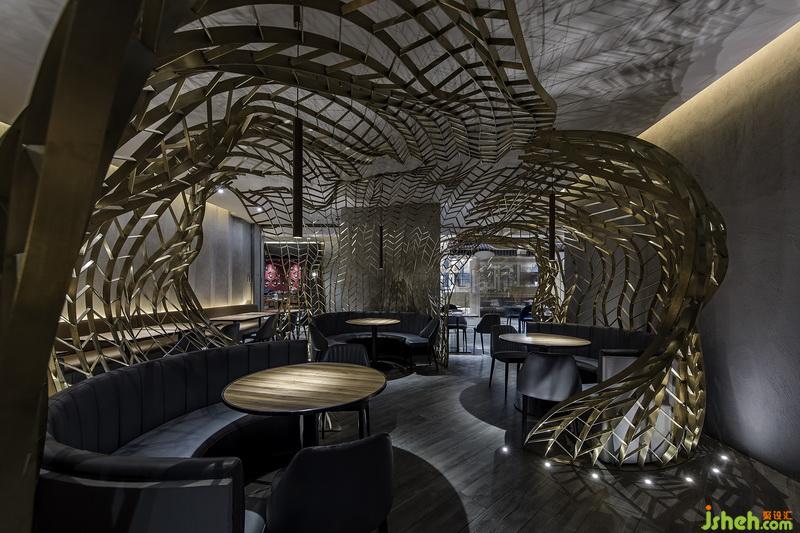銹鋼之間縱橫交錯,仿若自地無限生長的樹枝,透露出蓬勃的生命力。燈光透過網(wǎng)狀裝置縫隙,投下了相互交錯的光影,光影搖曳之間,宛如樹影斑駁,風吹云動。