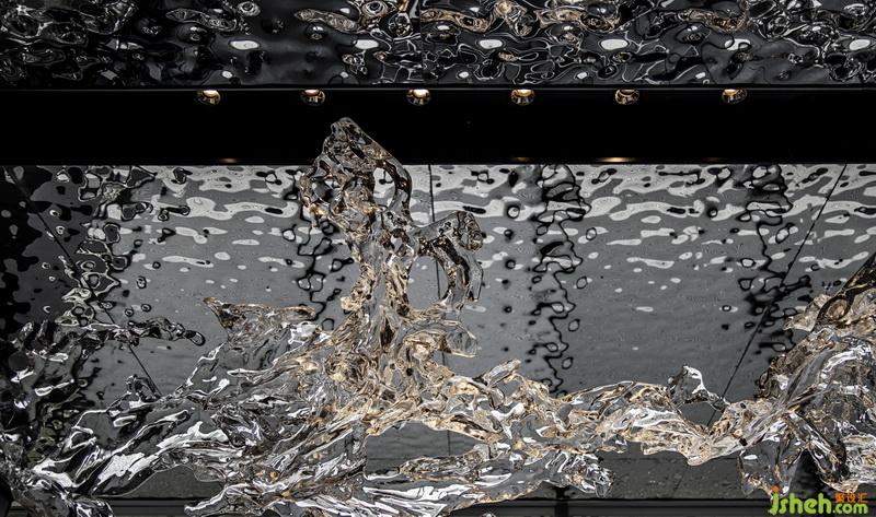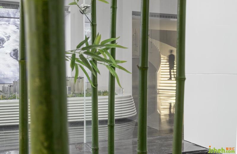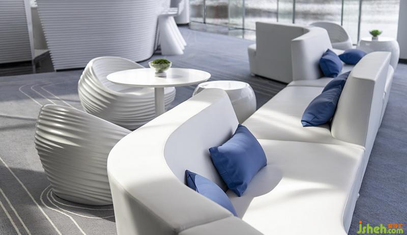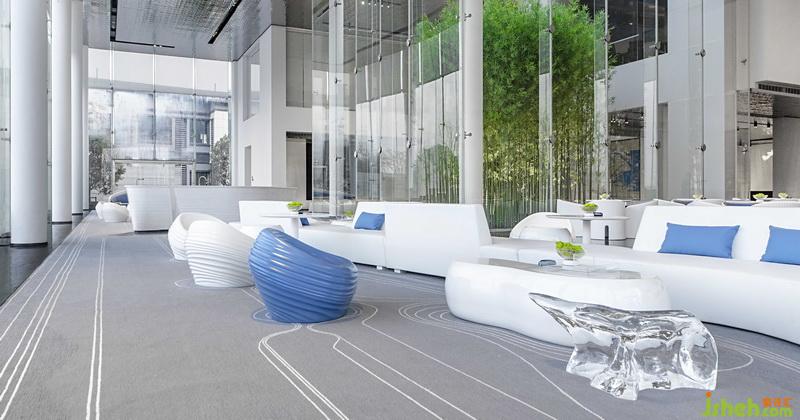 各個(gè)空間相互串通,人于空間內(nèi)游走,頗有移步異景之趣。洽談區(qū)呈條帶狀,地毯紋路如盈盈流水,不規(guī)則座椅作溪石,地毯曲線宛如“水”遇“溪石”所呈的蜿蜒曲折之狀,于空間中增添趣味。
