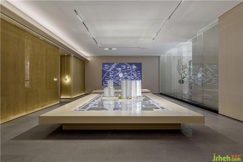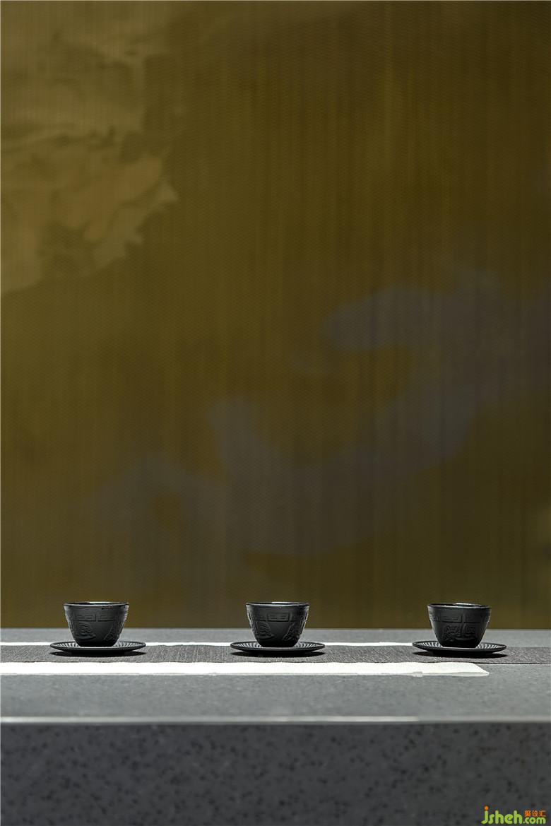 參觀者進入接待處,藉由茶臺產生幾分親近感,加之背景墻山水畫的貫穿,猶如品茗于山水之間,嘗一杯詩意,于空間中自得閑適。