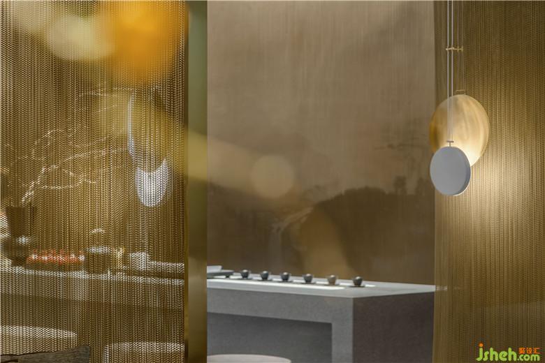 接待區(qū)與洽談區(qū)以屏風進行分割,屏風采用金屬布簾材質,形成隔而未界的效果,在視線上擴充了空間感,讓本不寬闊的空間顯得開闊通透。