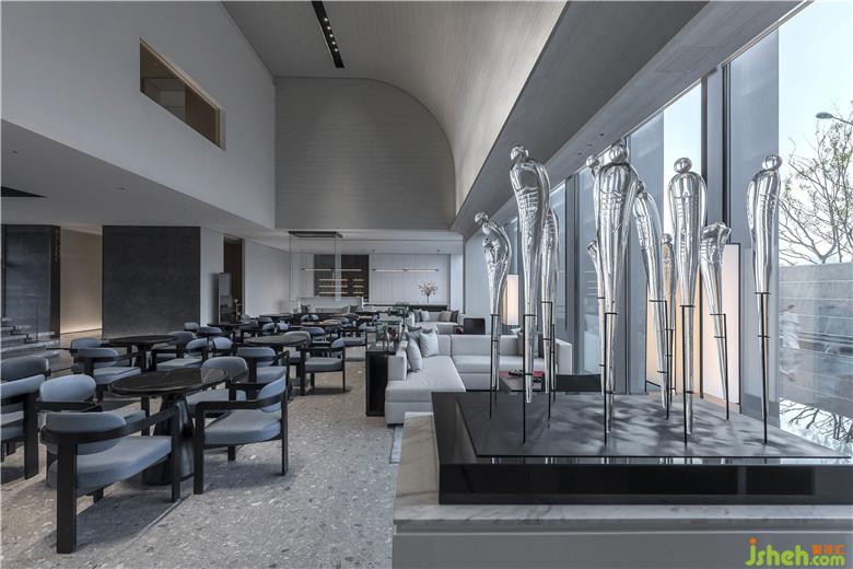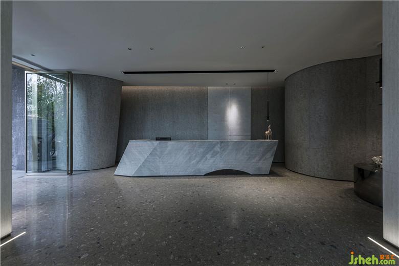 前臺(tái)接待區(qū)以大面積的灰調(diào)為主,斜面接待臺(tái)與云石肌理結(jié)合,趣味形狀碰撞質(zhì)感材料,現(xiàn)代感更強(qiáng)烈。底部拱形樣式,于空間之始,拋下了引子。