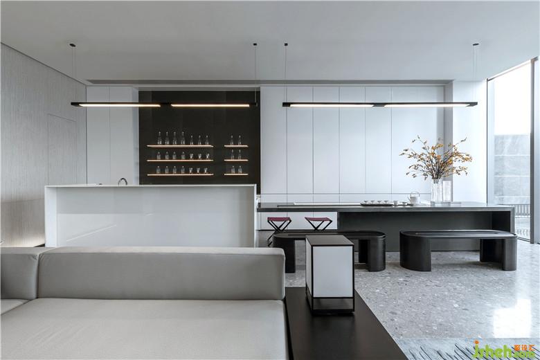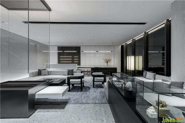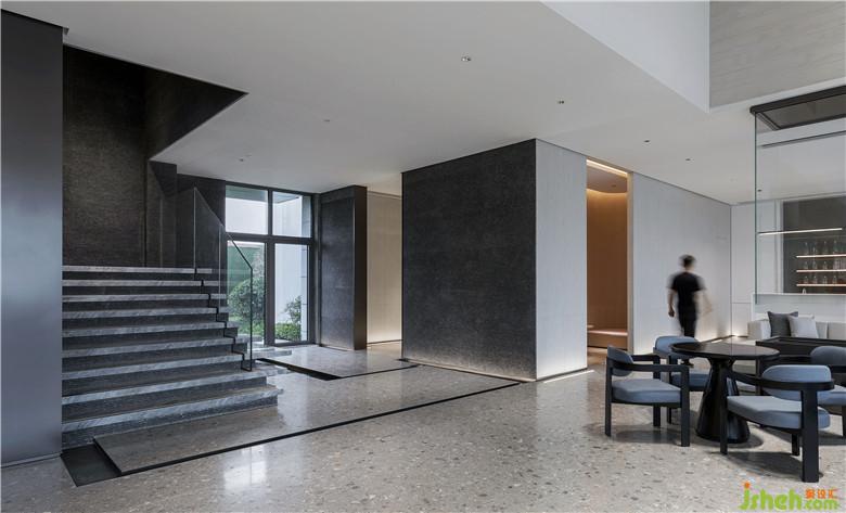深藍(lán)單人座椅與長(zhǎng)形灰白沙發(fā),柔和了空間的質(zhì)感,讓軟裝充滿素雅的基調(diào)。無(wú)論是洽談圓桌,或是黑色茶幾,皆賦予空間秩序般的美感。