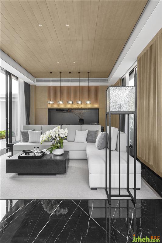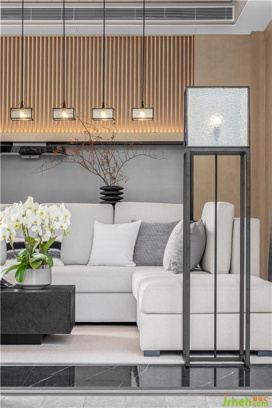 木質(zhì)的格柵給予客廳空間溫暖的包圍,質(zhì)樸的氣息由此流露而出。序列般的空間布局,半圍合沙發(fā)結(jié)合大理石地面,帶來(lái)舒適感與親近感,簡(jiǎn)約的元素,賦予室內(nèi)以靜雅。