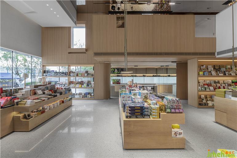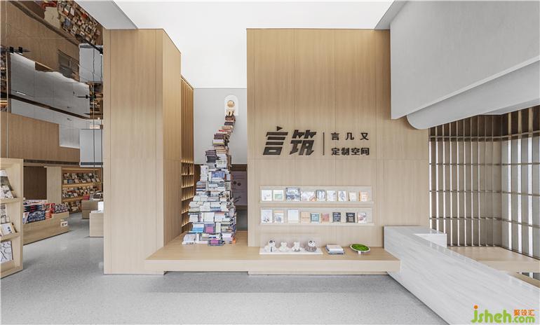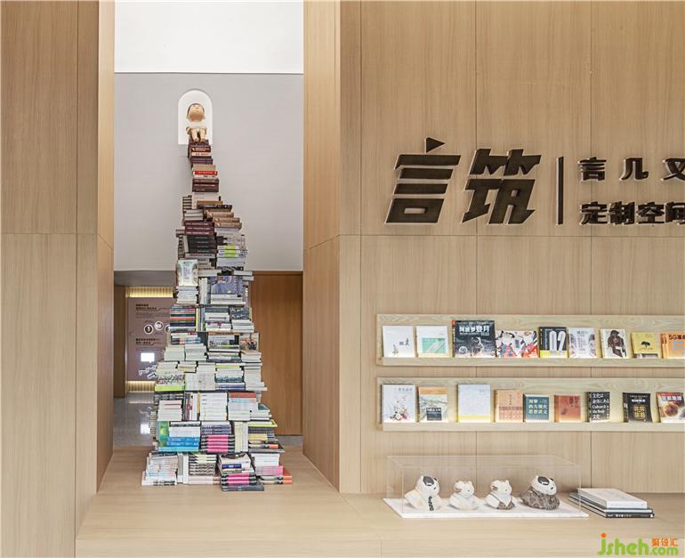 通過(guò)言幾又品牌的植入,加入悠閑的情景體驗(yàn),滿足生活的多種可能性。銷售中心設(shè)計(jì)趣味書本裝置,線條利落的原木書架與空間內(nèi)純粹的大理石肌理相結(jié)合,營(yíng)造出極具儀式感的前廳空間。