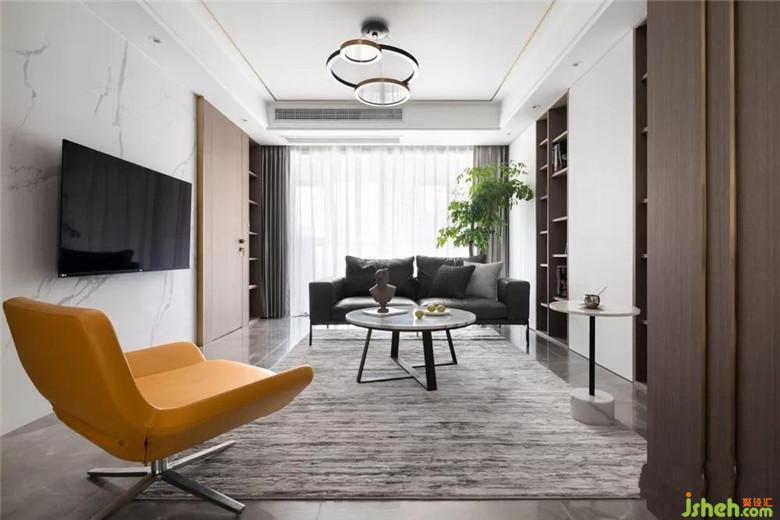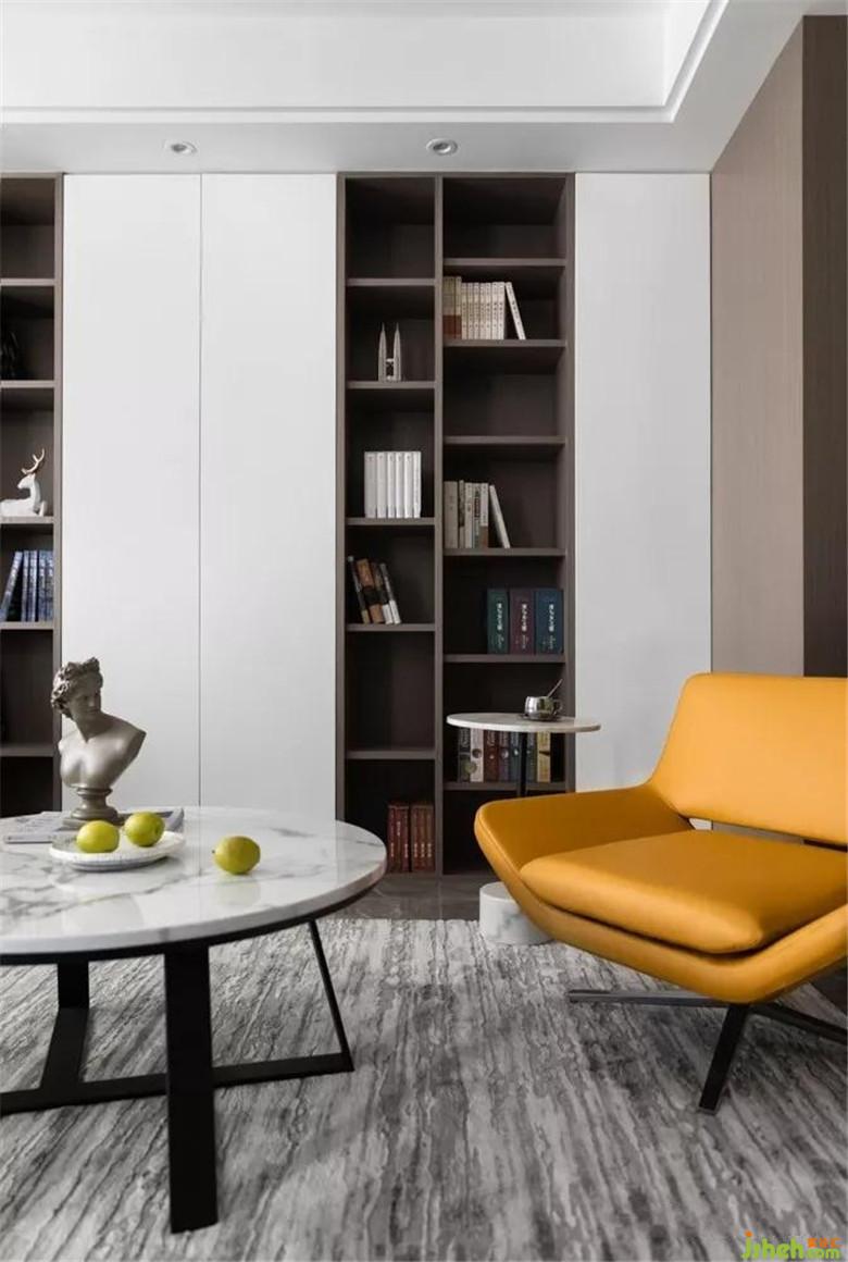 本案客廳對坐式的格局滿足了屋主對于互動交流以及閱讀收納的需求,同時考慮到收納及清理的便捷性,客廳正面柜體采用了柜體封閉與展示交錯的設(shè)計,豎向的線條拉伸了空間,使之顯得高挑