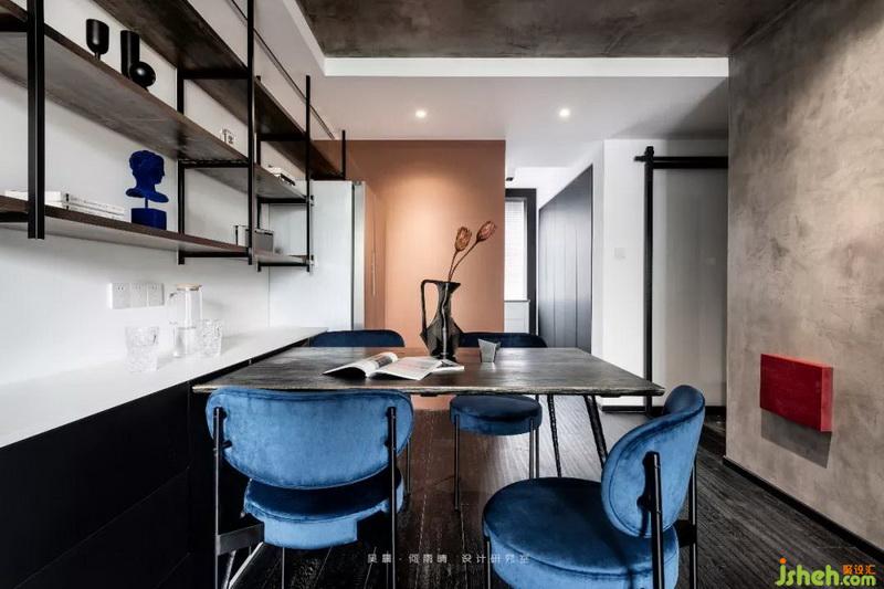 老房子層高的有限性、結(jié)構(gòu)梁的界限,不如就讓空間像游戲般,從機(jī)能和感官上都有不同的趣味變化,墻頂看似包裹卻又無限延伸。木制、黑白材質(zhì)滿足收納機(jī)能,藏藍(lán)、明紅等猶如舞臺(tái)劇產(chǎn)生戲劇沖突感。