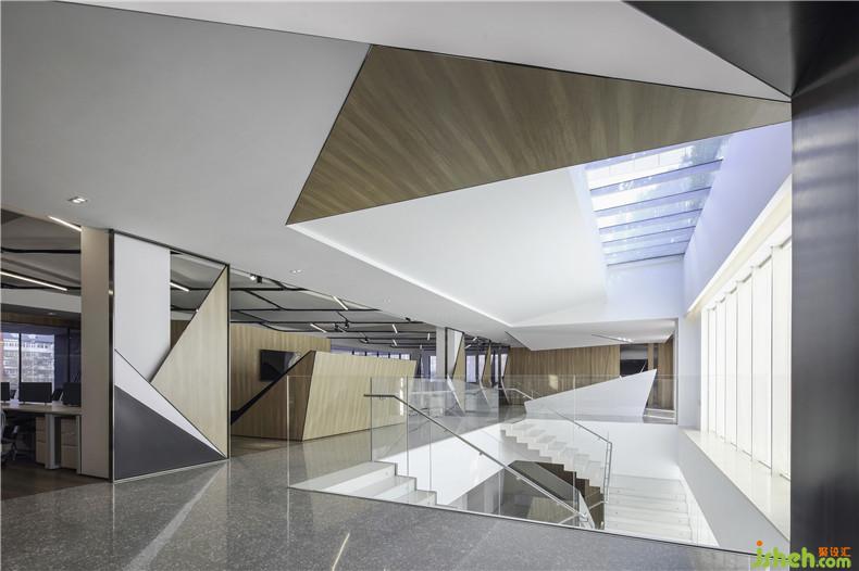 室內(nèi)空間與建筑元素情境而生,幾何視覺透過線面構(gòu)成,天花射燈如同舞臺軌道燈,形成不同的層次豐富視覺。三角切面及天窗構(gòu)筑為特殊來賓而打造的走廊,甫進大堂兩側(cè)是多層次的座位,以光線展現(xiàn)線條,開放的互動區(qū)減輕工作的疲憊,更增加員工間的交流機會,中間是偌大的多用途空間,無論是內(nèi)部團隊或是影視活動都提供靈活性及自由度。室內(nèi)設(shè)計師