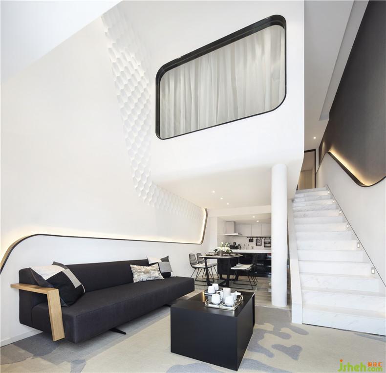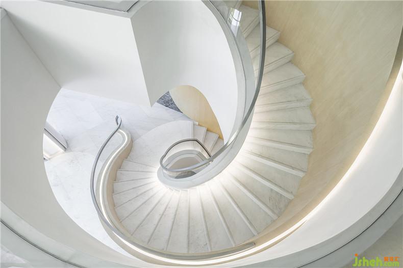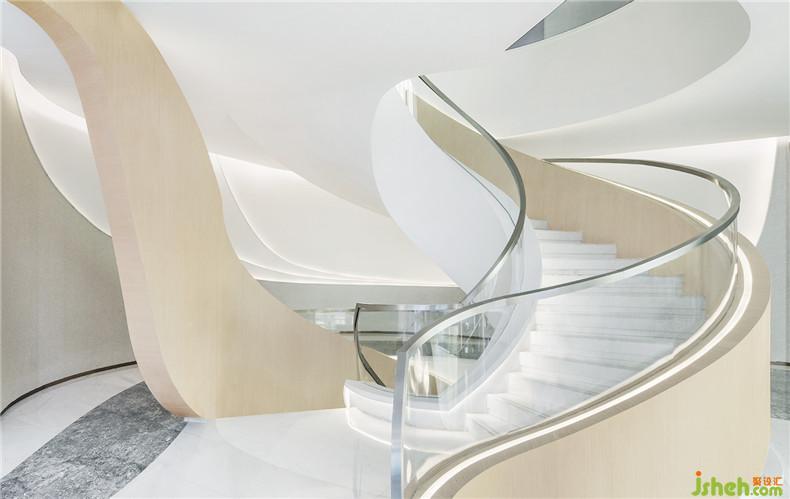 銷售中心的空間設(shè)計(jì)以無(wú)暇的白及簡(jiǎn)潔的弧線為主導(dǎo),呼應(yīng)建筑結(jié)構(gòu)自身流動(dòng)、向上的概念,大膽假設(shè)和定義人、建筑、空間及自然生態(tài)的新關(guān)系。隨著蜿蜒明亮的線條與螺旋形的樓梯,用者逐步過(guò)渡以至最后完全融入未來(lái)的空間。室內(nèi)設(shè)計(jì)師