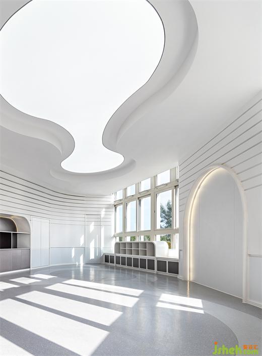 廈門幼兒園設計以云的層疊軌跡為核心貫穿空間,用豐富的疊級造型塑造空間,墻面和頂面更加完整化一體化,讓空間實現(xiàn)統(tǒng)一和純粹。