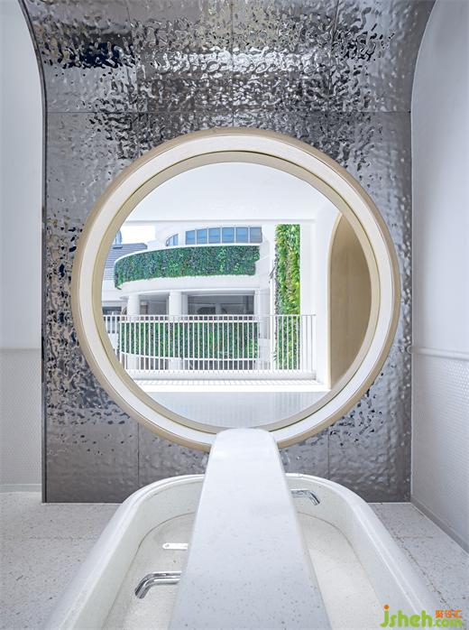 廈門幼兒園設計以借景手法,在波光粼粼的墻面打開一扇想象的窗。洗手成為了一個非常有樂趣的事,這個區(qū)域成為公共空間的一個焦點