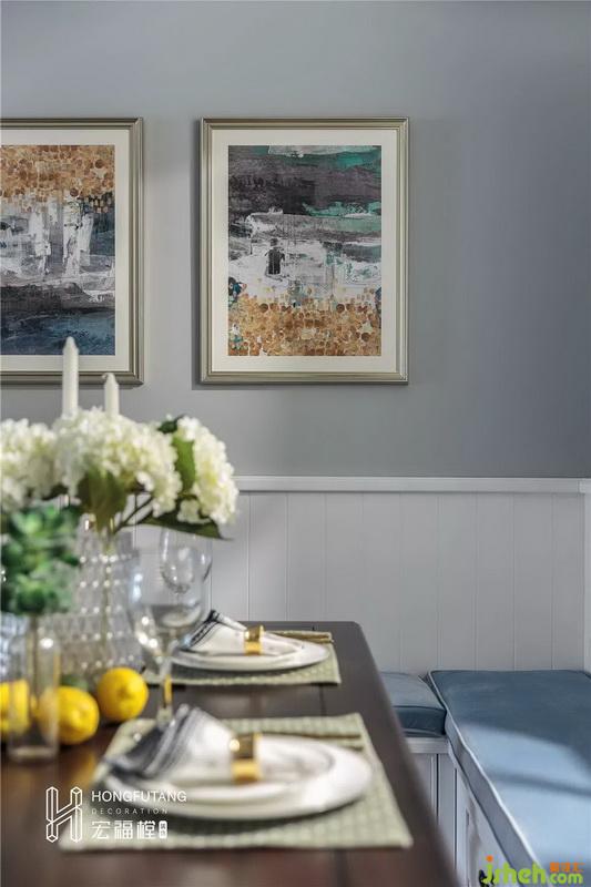 餐廳與客廳處于同一空間,也擁有著來(lái)自陽(yáng)臺(tái)的充足陽(yáng)光。餐桌延續(xù)茶幾邊幾同色調(diào)的深棕色,選用卡座搭配座椅,既可增設(shè)餐廳用餐座位,又利用卡座下方增設(shè)儲(chǔ)物收納的空間,其線條感也為整個(gè)空間增添了一絲美式氛圍。