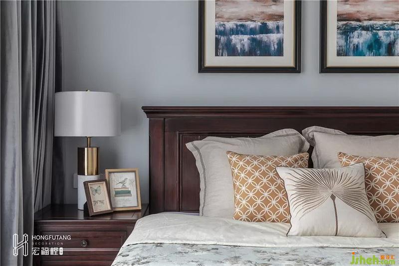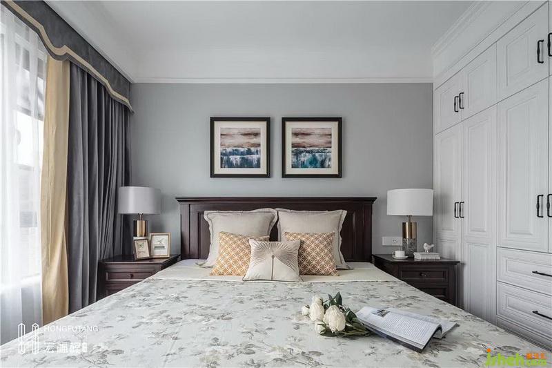 主臥延續(xù)整體風(fēng)格,色調(diào)安靜溫柔,木質(zhì)的床頭柜與床頭靠背又提升了家居品味;窗簾采用金色、灰色雙層相間,既不影響采光,又保留了臥室的私密性;同時(shí),拆除了主臥過(guò)道門(mén)垛,擴(kuò)大衣帽間,增加空間利用率的同時(shí)又與休息區(qū)域隔開(kāi),互不打擾。