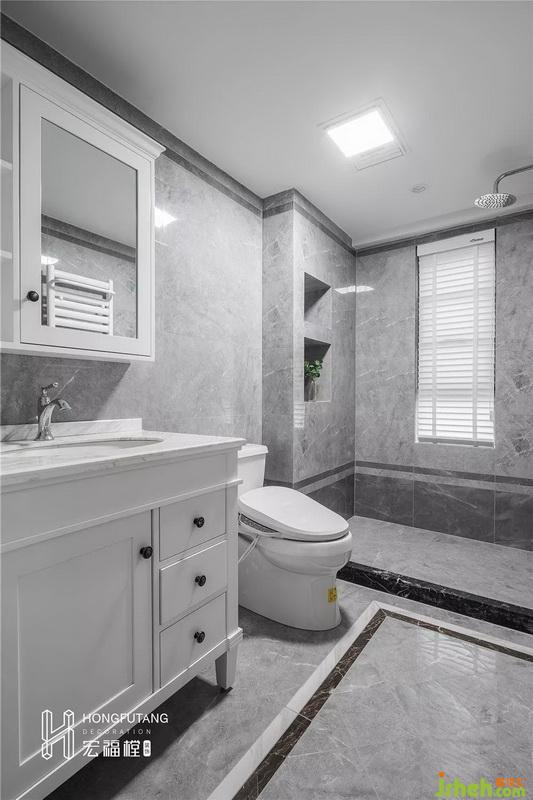 衛(wèi)生間采取了灰白色調(diào),整個(gè)空間干凈整齊,突出現(xiàn)代感;淋浴間的墻壁設(shè)計(jì)為兩個(gè)嵌入式空格,上層作為洗浴用品收納,合理利用空間,減少占用,下層擺放一盆綠植,為整個(gè)空間帶來(lái)一份生機(jī)和活力,弱化灰色帶來(lái)的生硬感。