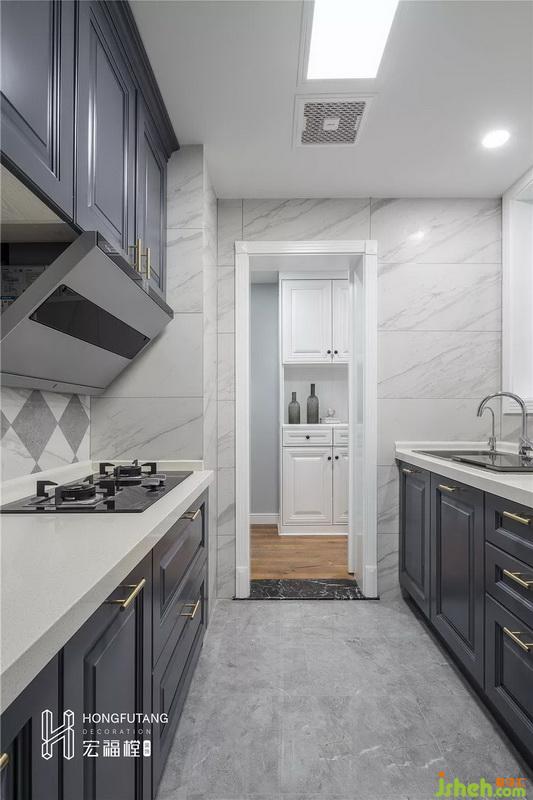 原來(lái)的廚房空間狹小,為擴(kuò)大廚房空間,將廚房向生活陽(yáng)臺(tái)擴(kuò)展了320mm;櫥柜靠墻相對(duì)而設(shè),從廚房門(mén)口望去,原來(lái)狹小的廚房便能給人一種通透的視覺(jué)效果。