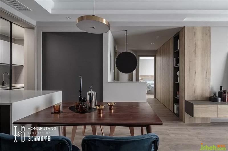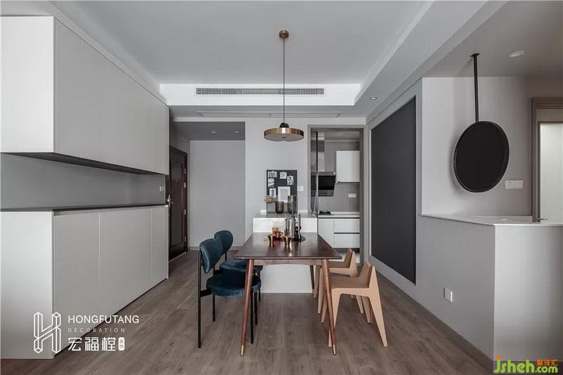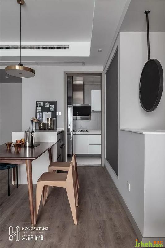 餐廳與客廳在同一空間內(nèi),利用走廊將兩個空間自然分隔;餐廳增加島臺,以餐臺+餐桌的形式體現(xiàn),利用剩余空間增加了可操作區(qū)域,餐廳的關(guān)聯(lián)性更強(qiáng);餐廳空間有限,為了不影響空間動線,在餐桌椅的選用上,選擇體態(tài)小,矮靠背的餐椅,藍(lán)色絲絨質(zhì)地的餐椅,舒適度強(qiáng),提高空間格調(diào);餐廳位于進(jìn)門左側(cè),右側(cè)設(shè)立頂天立地柜,可用作鞋柜和公共收納空間使用,選用中鏤空設(shè)計,從視覺上減少滿墻的呆板,鏤空位置也可作為進(jìn)門放置物品和擺放收納使用;餐廳墻體選用磁性黑板漆,可以選用磁貼、便利貼、留言等形式作為家庭交流互動的區(qū)域,一面黑板,就包含了主人對于生活及情感互動的理解和理想。