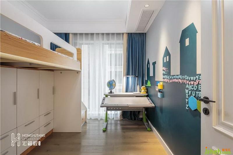 原始贈(zèng)送空間分割為二后,并入兒童房使用,兒童房擴(kuò)大1㎡;兒童房采取上下床的方式,上鋪?zhàn)∪?,下鋪設(shè)置成儲(chǔ)物柜,便于收納節(jié)省空間。書桌采用綠色和白色,搭配藍(lán)色童趣墻壁,整體風(fēng)格活潑青春。