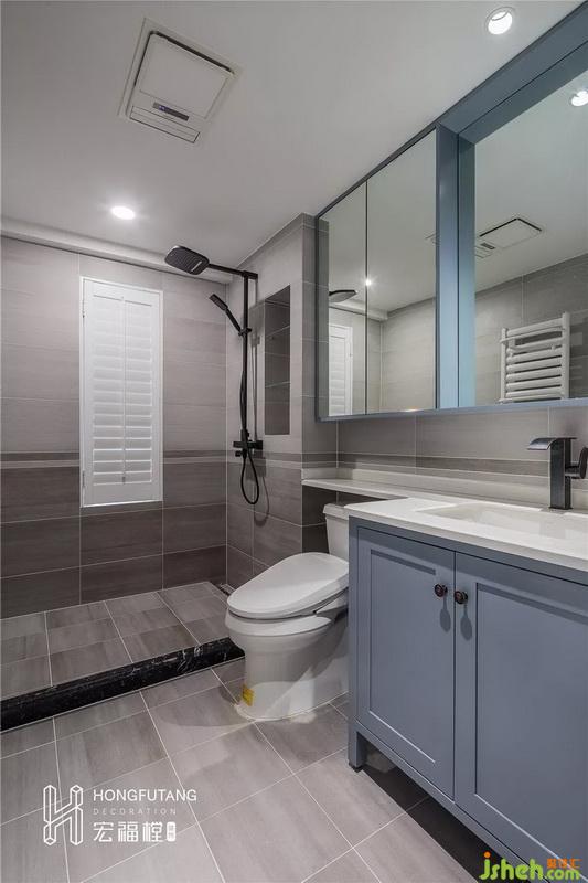 主衛(wèi)設(shè)計(jì)公司采用淡藍(lán)和白色的色調(diào),給人感覺干凈舒適。洗面盆、馬桶、淋浴間依次排列,干濕分離,保證空間的干凈整潔;在淋浴間內(nèi),設(shè)立嵌入式的空格,擺放洗漱物品,節(jié)約空間,便于收納。