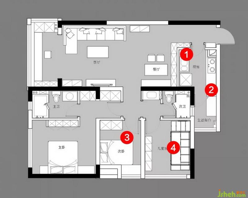 2、廚房往生活陽臺(tái)移動(dòng)320mm;