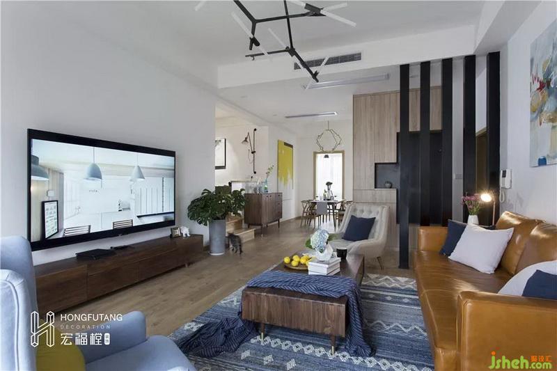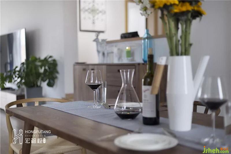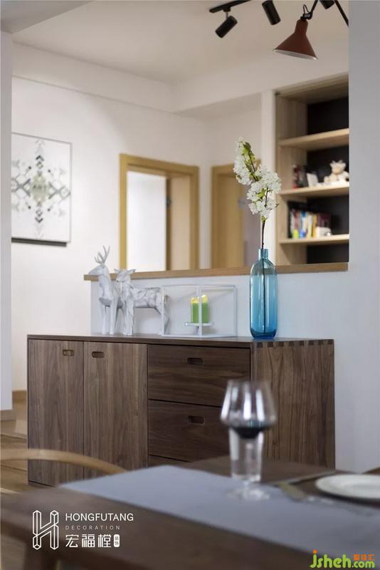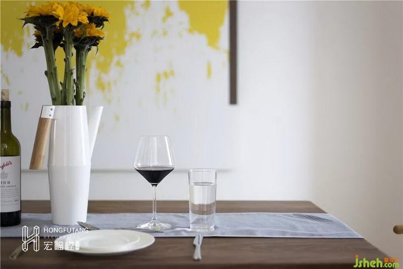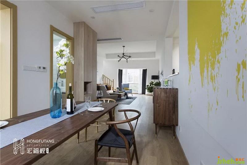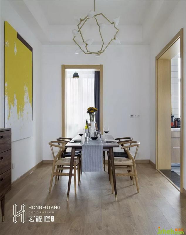 餐廳空間較長,所以在餐桌的選用上,選擇有長方形餐桌可以順餐廳空間擺放;左側(cè)靠書房留白區(qū)域設(shè)立斗柜,可達(dá)到擺放物件和收納使用;整個空間過于空白,在餐廳墻面選用色彩艷麗的明黃色壁畫提高餐廳的明度,活躍餐廳空間。