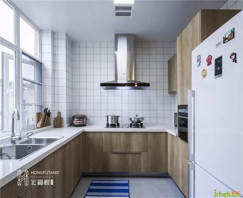 廚房進(jìn)門方向由西面改至北面,進(jìn)門方向的變動,解決了櫥柜地柜的操作問題,提高了廚房空間利用率,與餐廳之間劃分了更為合理的動線,也為公共衛(wèi)生間洗漱池的增設(shè)預(yù)留了位置;這個改造利于三個空間和諧布局,劃分更加合理。