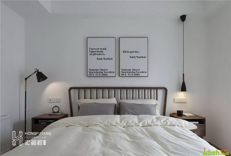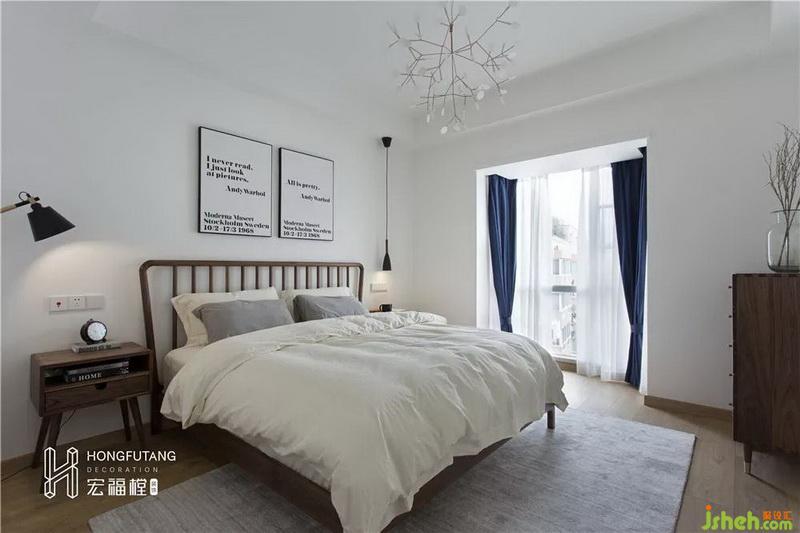 主臥空間以簡約為主,灰黑白三色搭配木色出現(xiàn),選用藍色作為軟裝色彩,更加親近自然,由于主臥空間本身有很大的衣帽間,所以在主臥內(nèi)只設(shè)立了斗柜作為日常收納和物品擺件使用。