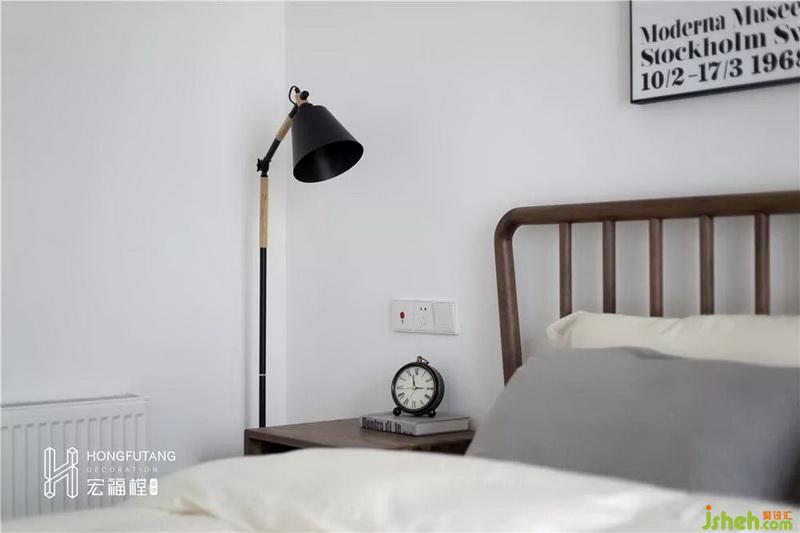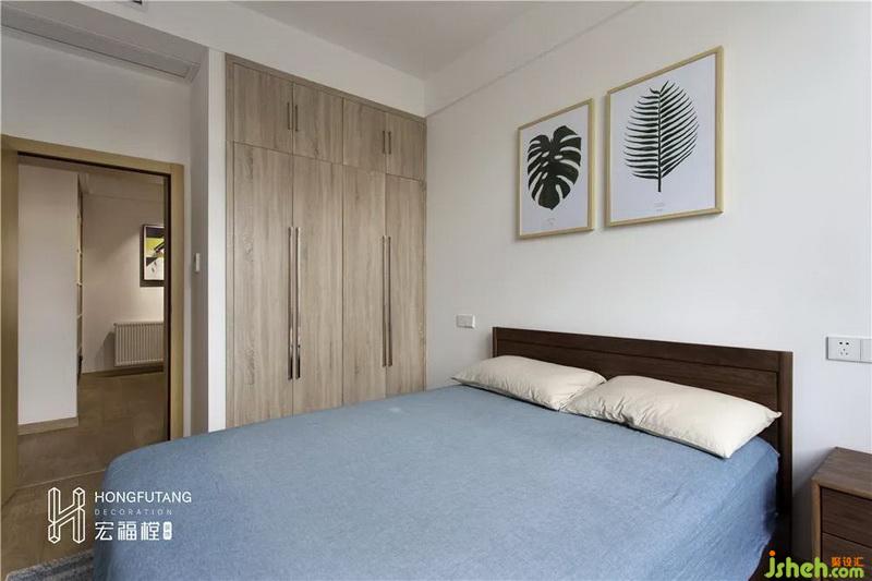 次臥空間面積相對較小,所以在布局上,將衣柜融入墻壁之中,選用深淺不一的木色家具突顯空間深度,在裝飾排列上還是以簡約為主。