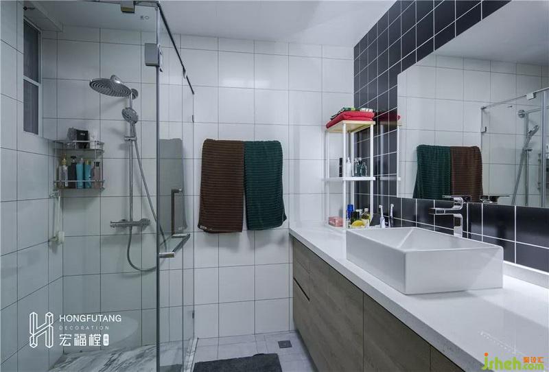主衛(wèi)調(diào)整了布局,滿足了業(yè)主對大浴室柜的需求,利用更為合理;黑白網(wǎng)紅格子磚搭配,線條感更強;右側(cè)靠墻整面設(shè)立收納柜,增添了浴室收納空間,空間顯得更加整潔。