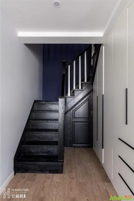 原本玄關(guān)布局散亂,不利于鞋柜擺放,浪費了樓梯及客廳的交界處空間。在利用樓梯空間時,將鐵質(zhì)樓梯拆掉換成木質(zhì)樓梯,用背靠背的兩組柜子隔離入戶和樓梯空間,面向入戶處作為玄關(guān)的鞋柜和儲物柜使用,面向樓梯處作為整個家里公共區(qū)域的儲藏柜使用,保證兩個空間獨立的同時,也增加了整個房屋的公共收納空間,同時還可將樓梯下面的空間利用起來作為小的雜物間使用。