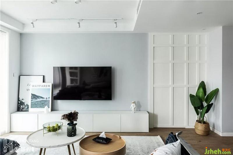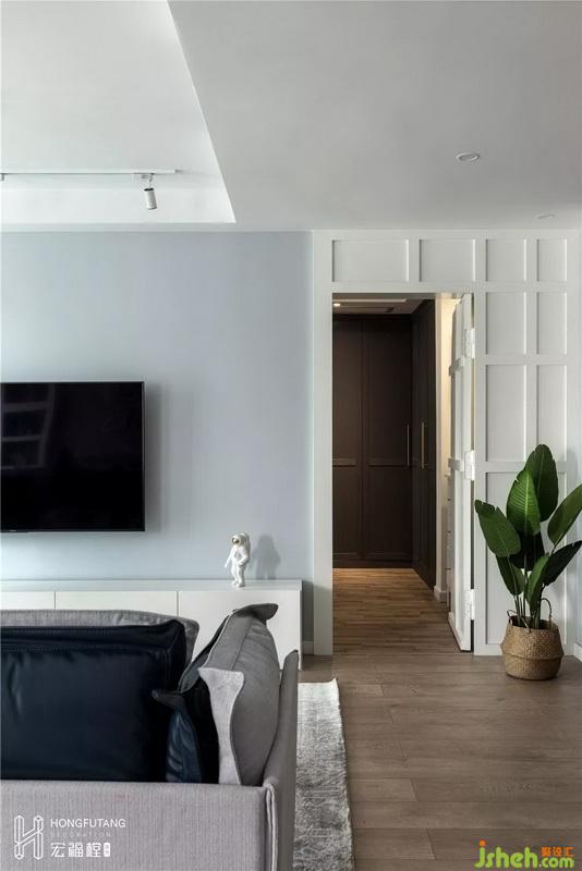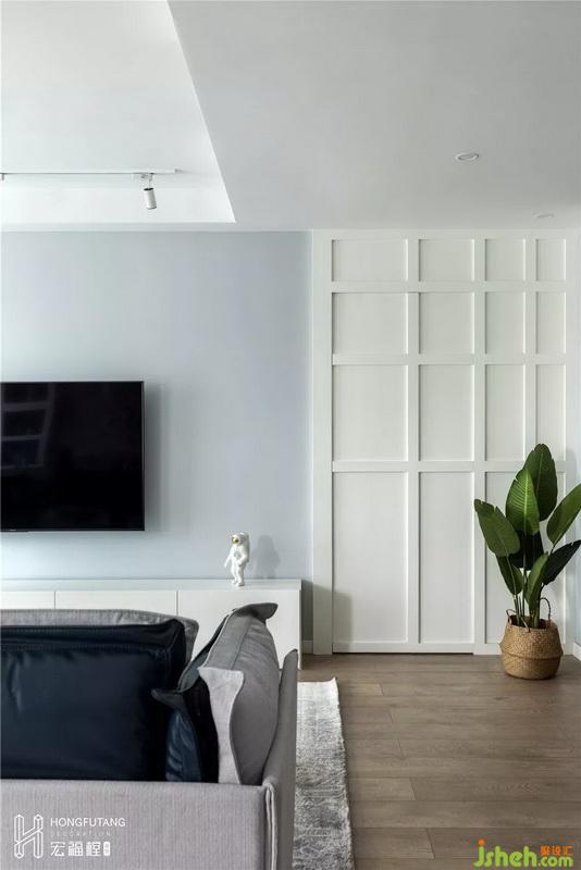 客廳家具主要以白色為主,選用原木地板搭配灰色,空間質(zhì)感精致簡潔,符合業(yè)主最初的要求;由于客廳本身采光好,在光源設(shè)計上,無主燈設(shè)計,減少燈具帶來的壓迫感。