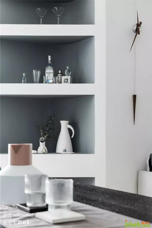 餐廳空間狹長(zhǎng),餐廳與窗子位置呈異型,從風(fēng)水學(xué)和日常使用上來說,浪費(fèi)空間且不適用于常規(guī)改造,所以將餐廳到窗子之間的兩個(gè)大陰角做整體壁龕,可代替定制酒柜,用于物件陳設(shè)收納,切面設(shè)計(jì)使空間更整體簡(jiǎn)潔。