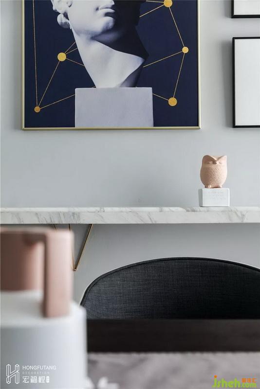 餐廳背面窗外為另一棟樓的立面,視線受阻,價(jià)值窗戶的位置不利于構(gòu)圖,在設(shè)計(jì)時(shí)考慮利用木質(zhì)百葉窗和拉通的石材隔板將整個(gè)餐廳背景墻構(gòu)成一個(gè)整體,保證了風(fēng)格的一致,簡(jiǎn)潔大方。