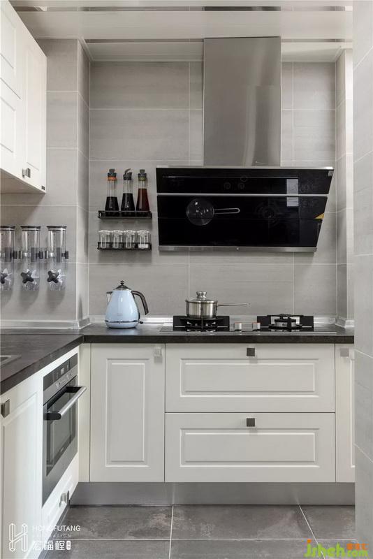 廚房面積較小,加之承重墻的原因,廚房無法從內(nèi)向外擴(kuò)大,只能將廚房向生活陽(yáng)臺(tái)延伸,增加一組1m臺(tái)面,可用于擺放廚房的小家電,緩解廚房壓力;因?yàn)樯铌?yáng)臺(tái)開間比較小,為了緩解轉(zhuǎn)角空間的逼仄感,將直角改成斜角,擴(kuò)大空間感。
