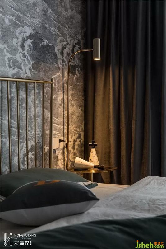 老人房選用網(wǎng)紅款烏云墻紙,搭配金屬材質(zhì)家具、棕色衣柜,深淺交錯(cuò),整體空間更整潔大方有層次感,墨綠色的選用符合房間沉穩(wěn)冷靜的空間氣質(zhì)。