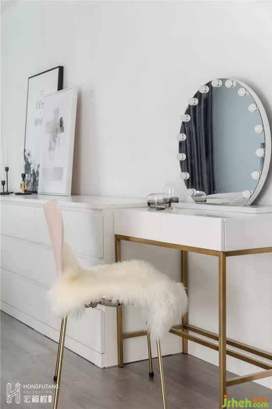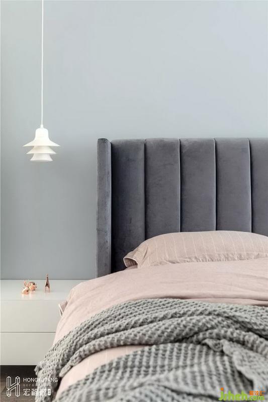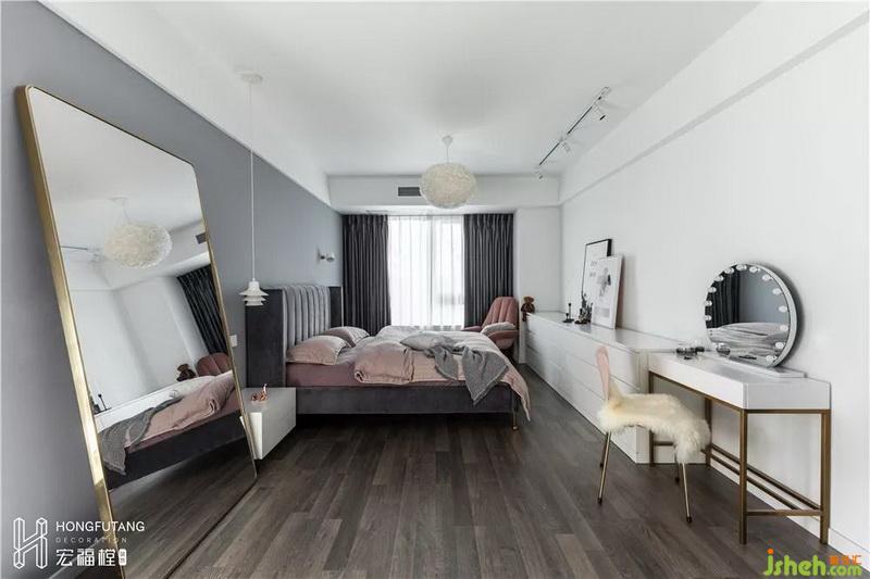 主臥空間色彩選用灰色搭配灰粉色,相比老人房更加溫柔,現(xiàn)代風(fēng)格融入其中;主臥內(nèi)選用的穿衣鏡、少女心梳妝臺都是女主人的喜好。