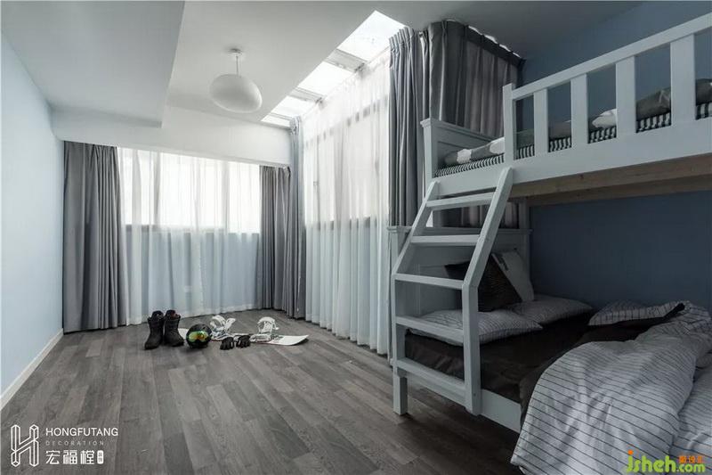兒童房沒有擺放過多的家具,選用子母床,節(jié)約空間,剩余空間都可作為小朋友活動玩耍區(qū)域。