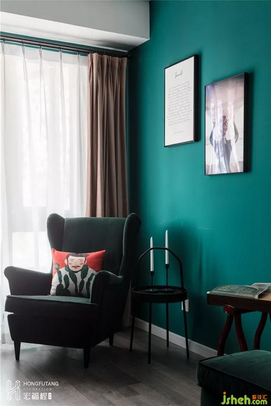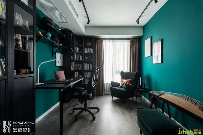 書房色調(diào)選用墨綠色搭配棕色系,空間風(fēng)格沉靜內(nèi)斂。