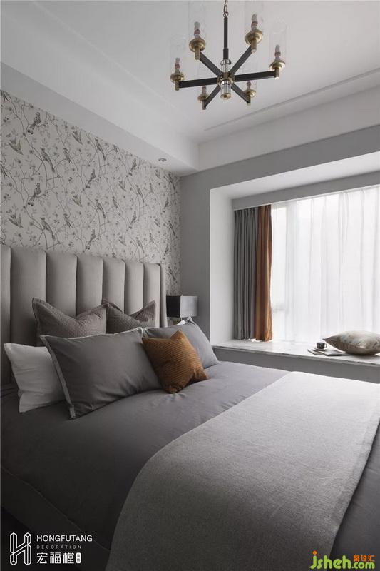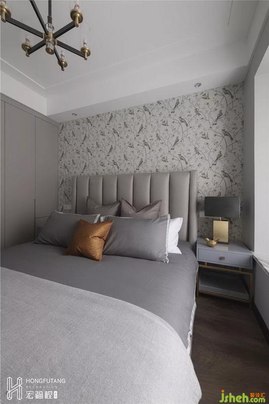 考慮到次臥主要為老人居住,所以顏色風格溫和,選用花鳥壁紙,為整個空間帶來生氣;選用土秋香這種熱烈的顏色小面積出現(xiàn)在軟裝處,提亮空間色彩;床頭選用軟包皮質,符合人體感知度,老人使用時更加舒適,減少磕碰。