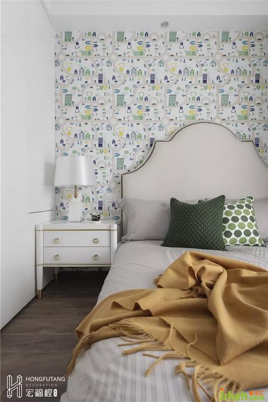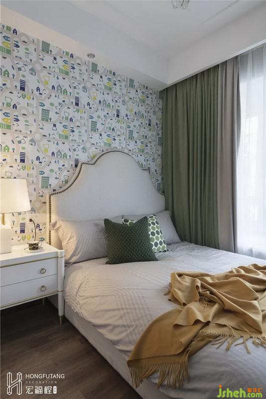 兒童房空間有限,所以一側靠窗邊擺放,節(jié)約空間;矮床的選用,減少小朋友摔下床的安全隱患;童趣壁紙活躍空間背景,軟裝選用綠色,空間更有生機活力。