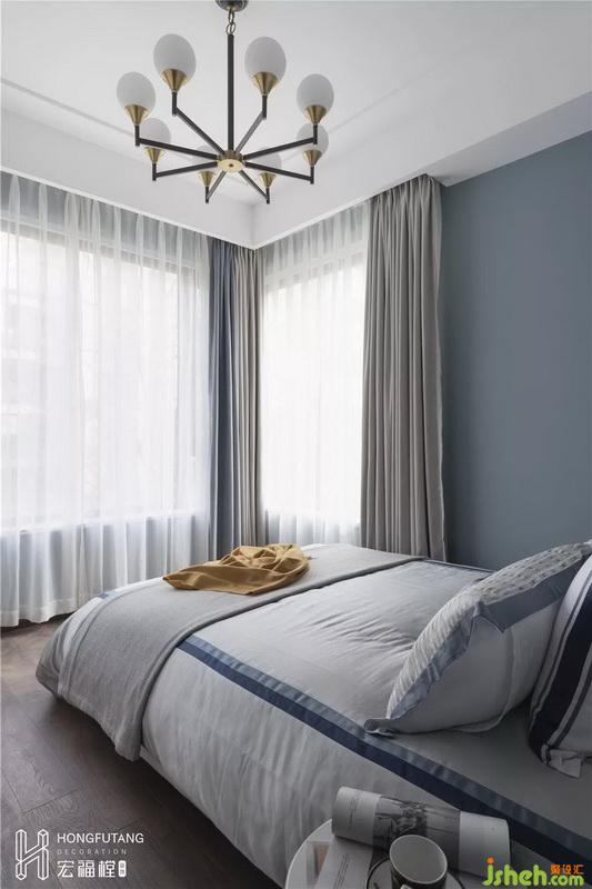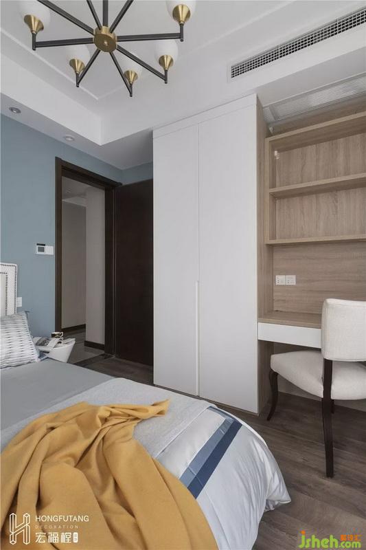 書房也可作為客房使用,依灰藍色墻面為主,利于空間的采光;書桌和衣柜采用一體式,滿足日常辦公、學習的同時,也能書籍收納、衣物收納的功能。