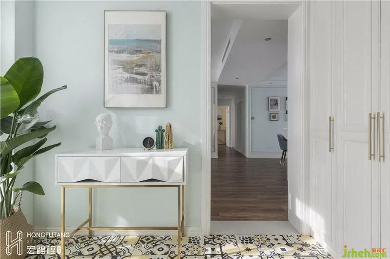 門廳空間為異形空間,空間面積充足,所以在右側(cè)依墻形狀設(shè)立收納柜,可作為鞋柜、進出換裝、收納空間使用,進門正對放置抽屜小桌可隨手放置背包和鑰匙物件。